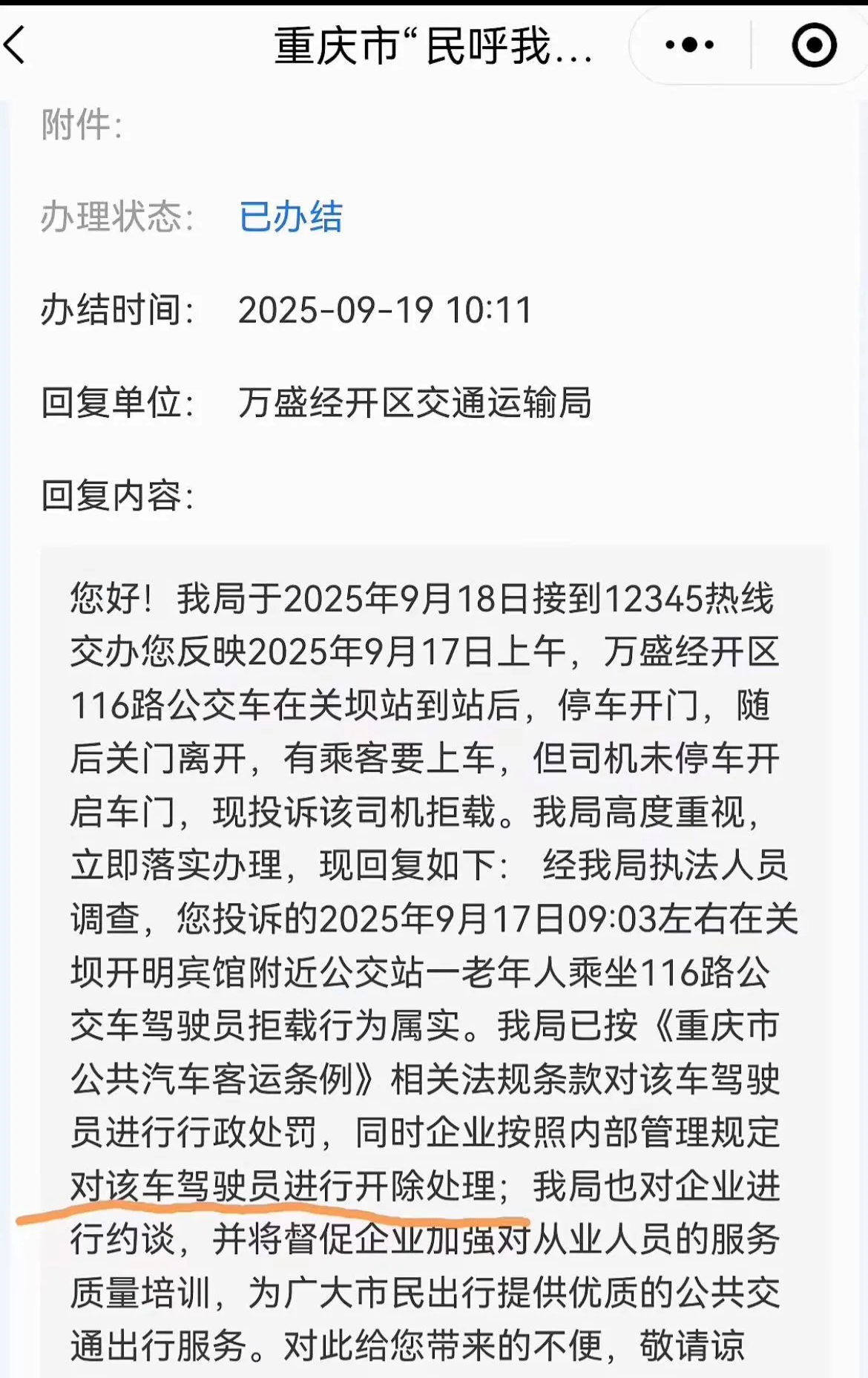 对此,万盛经开区交通运输局回复称,驾驶员拒载行为属实,已对涉事驾驶员作出行政处罚并开除处理。